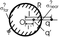 Аналогично находим плотность индуцированного заряда в удаленной точке, только там поле от заряда q направлено от центра, а от изображения - на центр. Сумма этих полей оказывается направленной к центру и по модулю равной:
