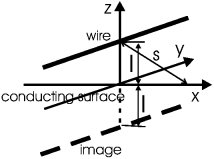 Такое же по абсолютной величине поле создается нитью-изображением. При векторном суммировании полей двух нитей параллельные плоскости компоненты уничтожаются, а перпендикулярные ей - удваиваются: