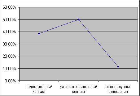 Рис.1. Результаты теста "Наедине с самим собой" (об отношениях с родителями) Анализируя работу гимназии с детьми группы риска мы увидели, что вся работа начинается с деятельности классного руководителя, который лучше других знает своих "трудных" учеников. Он взаимодействует со всеми гимназическими структурами (директором, завучами, социальным педагогом, психологом, учителями-предметниками, классным и школьным родительскими комитетами и т.п.) Взяв новый классный коллектив, классный руководитель выясняет: кто из ребят относится к "группе риска", по какой причине; кто состоит на внутришкольном учёте, когда и почему был поставлен на него; какие формы работы использовались с данным учащимся, какие из них явились более эффективными; в каких семьях и условиях проживают данные учащиеся (знакомится с актами посещения и картами учащихся, составленными предыдущим классным руководителем.) Исследования показали, что классному руководителю необходимо узнать особенности нового коллектива, какую роль играют в нём состоящие на учёте ребята из "группы риска" и заполнить на каждого из них карту учащегося. На основании собственных исследований и знакомства с работой классного руководителя мы составили социальные паспорта классов (Приложение 6). На основании всех социальных паспортов классов социальный педагог составляет социальный паспорт гимназии. Его анализ позволил нам составить таблицу 1, в которой указаны учащиеся требующие особого внимания. Таблица 1. Учащиеся, требующие особого внимания