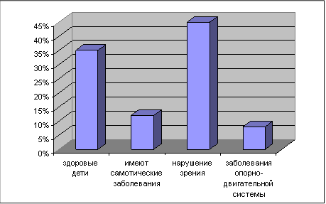 Изучение документов классного руководителя дополнили представления об обследуемых учащихся. Беседуя со школьным врачом, мы выяснили вопрос о состоянии здоровья исследуемых детей. Анализ исследований показал, что только 35% из числа исследованных относятся к практически здоровым детям (рис.2).