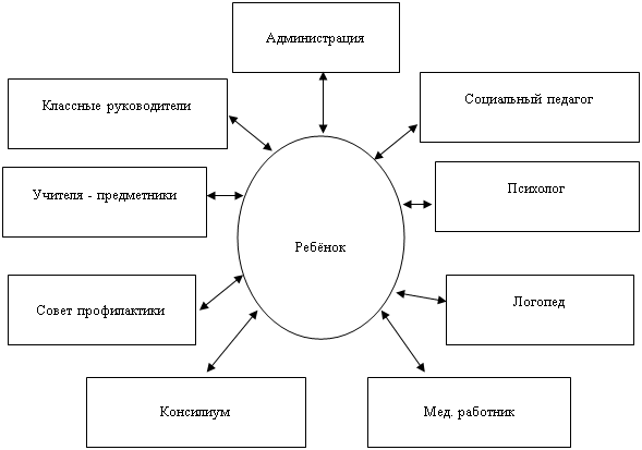 Схема: Профессионально-педагогическое сопровождение ребёнка гимназии №6 Предварительный этап сопровождения ребенка включает в себя обследование ребенка специалистами консилиума. Практика показывает, что первичное обследование должен проводить психолог и социальный педагог. Психолог собирает психологические сведения о ребенке, а социальный педагог собирает данные о семье и ближайшем окружении ребёнка группы риска. Они определяют, кто еще из специалистов должен подключиться и дополнить первичное обследование школьника. Таким образом, состав специалистов, реализующих программу профилактики в рамках СПк, сформирован таким образом, чтобы каждый из ее членов обладал определенными полномочиями в решении вопросов по оказанию помощи подросткам и их семьям. Кроме этого гимназия использует диагностику для выявления слабых звеньев в работе по профилактике и вносит предложения в вышестоящие инстанции о целесообразности включения в решение конкретных проблем ребёнка, специалистов системы профилактики для улучшения общего взаимодействия. Поскольку сил нескольких человек - социального педагога, психолога и инспектора по делам несовершеннолетних - недостаточно, поэтому гимназия выстраивает такую систему работы с детьми группы риска в осуществлении которой могли бы принять участие и учителя-предметники, и специалисты дополнительного образования, и волонтеры - старшеклассники, и родительская общественность. Таким образом, деятельность гимназии в работе с детьми группы риска в первую очередь предполагает совместную работу с ПДН и КДН, а также плановую работу медицинского работника с учащимися и т.д. Смысл данного взаимодействия - техническая и практическая помощь ребенку группы риска. После анализа ситуации и выявления основных проблем ребёнка определяется комплекс причин вызвавших данную ситуацию. При этом выявляется круг причин, на которые можно воздействовать с целью их изменения в условиях образовательного учреждения - с одной стороны и причин, на которые можно повлиять опосредованно через привлечение специалистов органов и служб системы профилактики - с другой. Одной из причин попадания детей в группу риска гимназия видит в семье. Анализ семейного положения детей группы риска показывает, что как правило родители не справляются со своими родительскими обязанностями или полностью отказались от них добровольно. Поэтому гимназия работает и семьями детей группы риска. Результатом диагностического этапа социально-педагогической технологии является составление карт личности