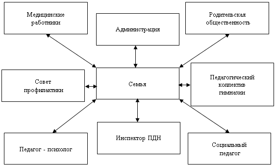 детей группы риска. Схема: Работа гимназии №6 с семьей Целью поискового этапа является оказание поддержки и принятие подростком на себя ответственности за возникновение и решение проблемы с использованием данных диагностического этапа; помощь в выявлении связанных с проблемой факторов и обстоятельств, причин, которые привели к затруднению. Поисковый этап предполагает и поддержку в определении цели предстоящего выбора: по ходу выяснения факторов и причин проявляются предварительные "рабочие" выводы и способы достижения целей как выхода из проблемы. Задача педагога поддержать подростка в любом выборе и выразить готовность помочь в любом случае. Договорный - проектирование действий педагога и ребёнка группы риска (разделение функций и ответственности по решению проблемы), налаживание договорных отношений и заключение договора в произвольной форме. В зависимости от характера проблемы и причин её вызвавших специалист применяет ту или иную социально-педагогическую технологию, разрабатывает совместно с подопечным наиболее оптимальные варианты разрешения того или иного противоречия Деятельностный - для обеспечения успеха педагог поддерживает подростка и морально - психологически, и, если надо, прямо защищать его интересы и права перед сверстниками, родителями, учителями, если это связано с обеспечением безопасности на пути самостоятельного действий. Рефлексивный этап - это обсуждение с ребёнком группы риска продвижение к решению проблемы. Опыт работы по комплексному сопровождению детей группы риска в гимназии показывает, что очень важно помочь ребёнку, замечать те изменения, которые происходят как в нем самом, так и вокруг него. По мнению специалистов, осуществляющих данную технологию в гимназии, рефлексивный этап может быть выделен как самостоятельный. Деятельность гимназии направлена на оказание своевременной помощи детям группы риска и привлечение специалистов для поддержки образовательного учреждения в профилактической работе с ними. Таким образом, гимназия решает две главные задачи: организация действенного взаимодействия специалистов социально-педагогических и других организаций в решении проблем несовершеннолетних; создание локальных (индивидуальных) программ профилактики правонарушений. §2.3 Программа "Жизнь дается один раз" В последние годы в подростковой среде наблюдается рост наркомании, курения, пьянства, токсикомании, что является причиной увеличения числа детей группы риска. Поэтому на заключительном этапе своей исследовательской деятельности по проблеме социально-педагогическое сопровождение детей группы риска мы опробировали программу "Жизнь даётся один раз" с учениками старших классов гимназии. Цель программы: Объединение основных участников профилактического процесса (образовательных, социальных, медицинских) для обеспечения условий профилактики употребления наркотических средств, психоактивных веществ, для создания условий полноценного развития ребенка, его социальной адаптации. Профилактика безнадзорности и правонарушений. Задача, которую мы перед собой ставили заключалась в организации и осуществлению действенной профилактики правонарушений, потребления наркотиков и других социальных отклонений среди подростков. Данную задачу нам помогали решать специалисты: пс