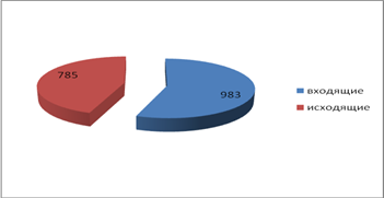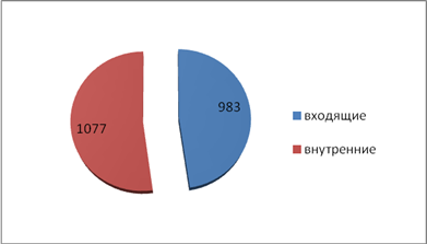 Рис. 4. Диаграмма – соотношение входящих и исходящих документов. (Составлено автором). Следующим соотношением будет количество входящих и внутренних документов, созданных в учреждении в 2010 году. Данное соотношение представлено (см. рис. 5, с. 75).