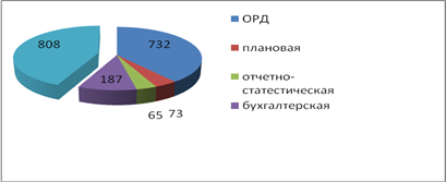 Рис. 7. Диаграмма – соотношение документов, созданных в ГУ СО «Центр…». (Составлено автором) Подсчет документации за определенный период времени в ГУ СО «Центр социального обслуживания граждан пожилого возраста инвалидов городского округа Сызрань» не проводился, никакие учетные записи не велись, как следствие у руководства нет никакого представления об объемах не только издаваемой документации, но и хранимой. Отсутствие цифр и статистических данных по количеству создаваемых в организации документов не позволяет определить необходимость, целесообразность, обязательность, срочность и скоординировать политику руководства в отношении мер по оптимизации делопроизводственных процедур. Автором дипломного исследования были проанализированы и подсчитаны документы организации за период 2010 года. При подсчете документооборота отдельно учитывались документы и их копии, подсчет велся по регистрационным формам входящих, внутренних и исходящих документов. С большой долей уверенности можно сказать, что повсеместно сведения об объеме документооборота в организации занижены, так как методика учета документов малосовершенна. Для наглядности автором дипломного исследования количество учтенных документов общества было представлены в табличной форме (см. рис. 8, с. 76).