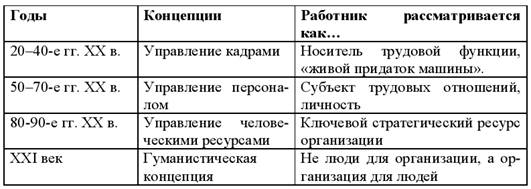 Эволюция кадрового менеджмента тесно связана с общими закономерностями развития общества, экономики, производства, техники и технологий. Вся история управления персоналом как отрасли науки может быть рассмотрена начиная с 1900 г., когда, по мнению исследователей, началась специализация в этой области деятельности. До того времени функции управления персоналом были прерогативой руководителя, который до 80% своего рабочего времени тратил на управление сотрудниками. В научной литературе представлены различные точки зрения на развитие кадрового менеджмента. А.Я. Кибанов отмечает, что корни управления персоналом уходят глубоко в историю человеческого общества. персонал организация производительность труд 2.2 Семь значительных этапов в развитии науки о персонале Формирование науки управления персоналом началось вместе с формированием теории управления как науки, которое произошло более ста лет назад в самом начале периода промышленной революции. Тогда управление организацией и управление ее персоналом не различались. Кроме того, наиболее ключевые проблемы науки об управлении относились к управлению персоналом. Теория и практика управления персоналом являлись основой управления как науки. В настоящее время научное направление "Управление персоналом" формируется на стыке теории и организации управления, психологии, социологии, конфликтологии, этики, экономики труда, трудового права, политики и ряда других наук. Развитие теорий управления персоналом (человеческими ресурсами) шло под влиянием различных школ управления. За более чем столетие (период промышленной революции) роль человека в организации существенно менялась, поэтому развивались, уточнялись и теории управления персоналом. По мере развития теории становятся все более гуманными. Таблица 2.2. Эволюция концепций управления персоналом