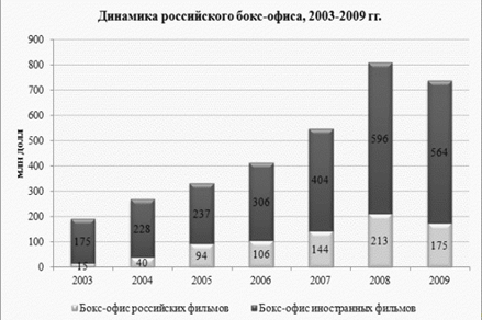 Стоит отметить, что в большинстве своем спонсорами являются заграничные компании, что указывает на неготовность российских компаний в современных рыночных условиях уделять внимание такой сфере, как культура, и выделять деньги, без возможности дальнейшего получения прибыли. Вторым аспектом, на который стоит обратить внимание, является то, что спонсоры финансируют, к сожалению, только наиболее крупные театры, в основном столичные, в то время как менее известным театрам приходится самим искать средства для продолжения деятельности. Процесс финансирования киноиндустрии происходит несколько иначе. Не так давно появилась информация, что государство собирается не просто существенно увеличить поддержку индустрии кино, но и поменять концепцию финансирования. Для целей финансирования отечественного кино был специально создан Федеральный фонд социально-экономической поддержки отечественной кинематографии, который будет давать почти 70% государственных дотаций. При этом дотации на кино от государства в 2009 году составили порядка 140 млн долларов. Раньше финансированием киноиндустрии занималось Министерство культуры, которое обычно давало кинокомпаниям до 1 млн долларов на фильм. В последние годы российское кинопроизводство выросло благодаря увеличению числа спонсоров, росту количества кинотеатров и увеличению зрительской аудитории. Это главные факторы роста. Дополнительным фактором выступала господдержка. Безусловно, финансовые трудности не могли не коснуться рынка отечественной киноиндустрии. В первую очередь они повлияли на строительство кинотеатров в России. Если предшествующие 3 года темпы роста количества кинотеатров в России составляли порядка 10-15% в год, то в 2009 году, когда было заморожено до 90% всех девелоперских проектов, в том числе по строительству кинотеатров, рост едва превысил 5%. Впрочем, рынок кинотеатров в России, главным образом, в Москве, уже стал насыщенным. Однако снижение темпов роста числа кинотеатров вкупе с уменьшением зрительской аудитории в связи с падением доходов населения сказалось на общем бокс-офисе российского кинопроката – он снизился почти на 9%, с 809 млн долларов в 2008 году до 738,7 млн долларов в 2009 году. График 1 Динамика российского бокс-офиса 2003-2009 гг.
