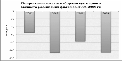 Таким образом, господдержка отечественной киноиндустрии казалась "спасительной соломинкой". Однако госсубсидирование, которое в последние несколько лет традиционно составляло лишь 50% бюджетов фильмов, не является единственным источником финансирования российского кинопроизводства. Помимо него существует еще, как минимум, три: частные инвестиции, реклама в фильмах (product placement), банковские кредиты. Частные вложения в кинобизнес - явление совсем не частое. Ведь заработать на кино можно, (в этом бизнесе реально собрать сверхприбыли от 200% до 500% на проект), но достичь такой прибыли достаточно сложно. Российское кинопроизводство, в основном, убыточно. Во-первых, потому что в доле слишком много участников: прибыль кинопроизводителя от проката составляет примерно 40% кассовых сборов, так как 50% уходит в доход кинотеатров, 10% - в доход дистрибьютеров, за вычетом бюджета фильма. А ведь размер бюджета кино, бывает, намного превышает эти самые 40% сборов. Поэтому и получается, что в большинстве своем финансируют кино не инвесторы, а спонсоры. График 2 Покрытие кассовыми сборами бюджета российских фильмов