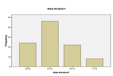 В ответах на вопрос о наличии или отсутствии у людей необходимости работать по найму (как и в приведенной выше оценке своего материального положения) у одиноких и семейных пенсионеров существенных различий не выявлено, хотя имеются отличия по округам Москвы (см. табл. 4). Из таблицы видно, что наибольшую потребность в продолжении работы испытывают пенсионеры Восточного округа Москвы, традиционно развитого в промышленном отношении, где многие пенсионеры еще надеются быть востребованными, в том числе и на предприятиях, где работали ранее. При этом среди одиноких пенсионеров этого округа таковых значительно больше (53,3%), чем среди живущих в семьях (36,7%). В других округах разница в характере ответов между одинокими и семейными пенсионерами не столь значительна, как в первом случае. Обратим особое внимание и на то, что среди москвичей-блокадников Ленинграда, как и среди ветеранов Центрального округа, заявивших о необходимости продолжать работу по найму, значительно больший удельный вес составляют, наоборот, семейные пенсионеры (62,3%), а не одинокие (37,5%). Итак, социологический опрос показал, что около 1/3 опрошенных московских пенсионеров согласны продолжать работу по найму. Но это не означает беспроблемного зачисления их на работу. С учетом здоровья, физических возможностей респонденты заявили, что они могли бы работать только при определенных условиях, а именно: «поблизости от места жительства - 99,4% опрошенных; неполный рабочий день - 7,3%; в свободном режиме - 35,8%; на дому - 31,5%; на временной работе - 25,3% (все от числа считающих необходимым работать). Ответы таким образом показывают, что большинство желающих работать нуждается в индивидуальном трудовом режиме. Реально оценивая свой трудовой ресурс, подавляющее большинство их (83,3%) согласно трудиться на любой посильной работе; а 16,7% - только по своей специальности. Это свидетельствует о весьма скромных запросах большинства пенсионеров в выборе видов трудовой занятости». Полученная информация о материальном положении, об удельном весе желающих и могущих работать пенсионеров, о возможных сферах применения их труда и т.д., дает основание предположить, что речь идет о многих тысячах москвичей, готовых трудиться на непрестижных, но очень нужных городу рабочих местах. 2.2 Положение работающих пенсионеров на рынке труда г. Москвы Проблема трудозанятости работающих пенсионеров является одной из самых распространенных в России. Последние социологические исследования и данные официальной трудовой статистики показывают, что пенсионеры продолжают работать несмотря на их здоровье, на их положение и т.д. Но главное проблемой является то, что взгляды пенсионеров и взгляды государства на то, где они должны работать, какие места занимать, сколько должны получать, не совпадают. В данном параграфе автор дипломной работы изучает положение работающих пенсионеров и стремится представить анализ результатов собственного социологического исследования на тему «Положение работающих пенсионеров на рынке труда г. Москвы» (см. Приложение 1). В исследование принимали участие 100 пенсионеров в возрасте от 55 до 75 лет, из них 24 % в возрасте от 55 до 60 лет, 46 % в возрасте от 61 до 65 лет, 22 % в возрасте от 66 до 70 лет, и 8 % в возрасте от 71 до 75 лет (см. Диаграмма 1).
