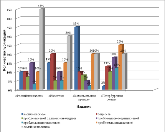 Дипломная работа: Освещение проблем семьи в ведущих российских изданияхДипломная работа: Освещение проблем семьи в ведущих российских изданияхОглавлениеВведение Глава I. Семья как социальный институт и её основые проблемы 1.1 Понятие семьи 1.2 Основные проблемы семей России Глава II. Проблемы семьи в зеркале СМИ 2.1 Исследуемые издания 2.2 Результаты исследования 2.3 Подведение итогов контент-анализа Заключение Список литературы Приложения Введение Конфуций писал: «Государство - это большая семья, а семья это маленькое государство, и держится оно на любви». Надо ли говорить для чего человеку семья? Мы можем предположить, что каждый ответит по-своему, но наверняка прозвучит одна простая и верная мысль - для счастья. Да, человеческое счастье вряд ли возможно без семьи. Ни самая увлекательная работа, ни друзья не могут дать того, что может дать семья. Где, как не в семье, получает человек то, к чему стремится в любом возрасте: ощущение своей нужности близким, осознание, что любим или любишь сам, веру, что есть на земле место, где тебя ждут и любят. Где, как не в семье, человек получает заряд любви и бодрости, творческих и духовных сил, без которых он не может нормально жить и работать. Где, как не в семье, получают люди прекрасный дар - счастья материнства и отцовства. В нашем современном обществе большую роль в формировании образа современной семьи играют средства массовой информации. СМИ стали частью системы социализации подрастающего поколения и взрослых; они играют важнейшую роль в формировании общественного мнения, оценок людей и событий и задают массам некие стандарты жизни и сознания. По-разному относясь к тем или иным конкретным средствам информации или к представляемым там конкретным материалам, современные люди тем не менее уже не мыслят своей жизни без газет, журналов, радио или телевидения, которые оперативно рассказывают о важнейших событиях в мире, стране, городе. Они не только отражают сформированные в социальной жизни нормы и ценности, но и способствуют их распространению и социальному освоению и даже создают новые поведенческие и эмоциональные идеи. Цель нашей дипломной работы – проанализировать, насколько полно и объективно ведущие российские издания освещают как основные проблемы семьи, так и новые законы, законопроекты, касающиеся данного вопроса. Согласно нашей гипотезе российская пресса не вполне справляется со своими обязанностями по предоставлению обществу объективной и исчерпывающей информации о проблемах семьи. Так это или нет – нам предстоит проверить в ходе исследования. Для достижения поставленной цели мы должны решить следующие задачи: 1. проанализировать сущность, структуру и функции семьи как социального института; 2. дать характеристику основным проблемам семьи в современной России; 3. изучить особенности освещения проблем семьи в ведущих печатных изданиях России; 4. определить, в какой мере российская пресса справляется со своими важнейшими функциями; 5. на основе проведенного анализа предложить ряд рекомендаций средствам массовой информации. Объект исследования носит двусоставный характер. Во-первых, объектом исследования можно назвать проблемы семьи. Во-вторых, объектом исследования является российская пресса. Предмет исследования – освещение проблем семьи в ведущих российских изданиях