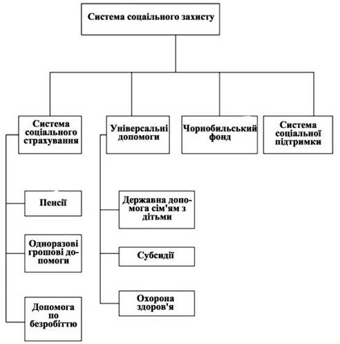 Рисунок 1.1 Система соціального захисту соціальний захист через недержавні організації: соціальна допомога з фондів підприємств. Система соціального захисту населення складається з: соціального страхування; соціальної допомоги; соціальних гарантій; Система соціального страхування і пенсійного забезпечення, що діє в Україні включає у себе [17, с.63-75]: пенсійну систему; соціальне страхування на випадок безробіття; соціальне страхування у зв’язку з тимчасовою втратою працездатності; соціальне страхування від нещасних випадків. Витрати на соціальний захист залежать від можливостей економіки. В країнах з ринковою економікою склалася троїста система фінансування соціальних програм, суб'єктами якої виступають держава, роботодавці та одержувач соціальних виплат. Вирішення питання про фінансування соціальних програм виявляється надзвичайно важливим з точки зору рівня заробітної плати, тому що дає змогу приєднувати до неї кошти, які витрачаються централізовано із суспільних фондів споживання. Отже, загальна характеристика системи соціального захисту населення України дає змогу зрозуміти ланкову структуру, зміст та принципи діяльності соціально-державної сфери. 1.3 Основні види нормативно-правових актів, що регулюють відносини в сфері соціального захисту населенняВ умовах незалежної держави створення національної системи соціальних гарантій має першочергове значення. Основні принципи такої системи закладені в Конституції України, де зазначено, що громадяни України мають право [21, с.115]: на достатній життєвий рівень для себе і своєї сім'ї, що включає достатнє харчування, одяг, житло; на соціальний захист, що включає право на забезпечення їх у разі повної, часткової або тимчасової втрати працездатності, втрати годувальника, безробіття з незалежних від них причин, а також у старості та в інших випадках, передбачених законодавством. Пенсії, інші види соціальних виплат і допомоги, що є основним джерелом існування, мають забезпечувати рівень життя, не нижчий від прожиткового, встановленого законодавством; на охорону здоров'я, медичну допомогу та медичне страхування. Держава створює умови для ефективного й доступного усім громадянам медичного обслуговування. У державних і комунальних закладах охорони здоров'я медична допомога надається безплатно; наявна мережа таких закладів не може бути зменшена. Держава сприяє розвиткові лікувальних закладів усіх форм власності; на освіту. Повна загальна середня освіта є обов'язковою. Держава забезпечує доступність і безплатність дошкільної, повної загальної середньої, професійно-технічної, вищої освіти в державних і комунальних навчальних закладах; надання державних стипендій та пільг учням і студентам. Громадяни мають право безплатно здобути вищу освіту в державних і комунальних навчальних закладах на конкурсній основі. Відповідно до ст.46 Конституції України громадяни мають право на соціальний захист, що включає право на забезпечення їх у разі повної, часткової або тимчасової втрати працездатності, втрати годувальника, безробіття з незалежних від них обставин, а також у старості та в інших випадках, передбачених законом [1]. Це право гарантується загальнообов’язковим державним соціальним страхуванням за рахунок страхових внесків громадян, підприємств, установ і організацій