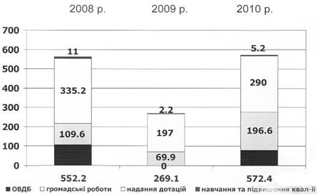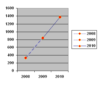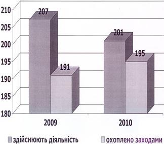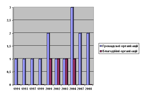 Рисунок 3.12. Динаміка створення організацій Діяльність вище зазначених організацій здійснюється у таких основних напрямах: сприяння практичному здійсненню загальнодержавних, регіональних, місцевих та міжнародних програм, що спрямовані на поліпшення соціально-економічного становища; поліпшення матеріального становища набувачів благодійної допомоги, сприяння соціальній реабілітації малозабезпечених, безробітних, інвалідів, інших осіб, які потребують піклування, а також подання допомоги особам, які через свої фізичні або інші вади обмежені в реалізації своїх прав і законних інтересів; подання допомоги громадянам, які постраждали внаслідок стихійного лиха, екологічних, техногенних та інших катастроф, у результаті соціальних конфліктів, нещасних випадків, а також жертвам репресій, біженцям; сприяння розвитку культури, в тому числі реалізації програм національно-культурного розвитку, доступові всіх верств населення, особливо малозабезпечених, до культурних цінностей та художньої творчості; подання допомоги талановитій творчій молоді; сприяння охороні і збереженню культурної спадщини, історико-культурного середовища, пам'яток історії та культури, місць поховання; сприяння розвитку охорони здоров'я, масової фізичної культури, спорту і туризму, пропагування здорового способу життя, участь у поданні медичної допомоги населенню та здійснення соціального догляду за хворими, інвалідами, одинокими, людьми похилого віку та іншими особами, які через свої фізичні, матеріальні чи інші особливості потребують соціальної підтримки та піклування; сприяння захисту материнства та дитинства, подання допомоги багатодітним та малозабезпеченим сім'ям. Аналіз затребуваності громадськістю вище зазначених послуг недержавних організацій постійно зростає, у зв’язку із доступністю та ефективним досягненням цілей (Табл.3.3, Рис.3.14). Таблиця 3.3 Кількість послуг наданих недержавними організаціями Деражнянського регіону за 2008 - 2010 рр.