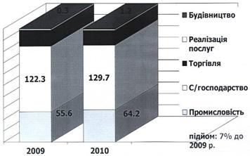 Рисунок 3.1 Динаміка чисельності осіб працездатного віку та працюючих за 2008-2010 рр. В свою чергу структура економіки Деражнянського району за обсягами виробництва валової продукції та послуг будівництва, торгівлі, сільського господарства, промисловості виявив підйом у 2010р. у відношенні до 2009р на 7% (Рис.3.2):