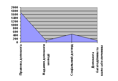 Рисунок 3.14. Показник кількості послуг Отже, аналіз діяльності недержавних організацій та їх кількість у Деражнянському регіоні встановив, що показник якісного руху з кожним роком все більше зростає, що, в свою чергу, вказує про затребуваність спеціалістів галузі соціального спрямування та соціальної роботи в загалом. В свою чергу, дослідження діяльності державних та недержавних організацій соціальної сфери в напрямку покращення системи соціального захисту виявило, перш за все, ефективність законодавчої бази, що справляє значний вплив на дану діяльність. Хоча проблематичність деяких фінансових аспектів, які нависають великим тягарем над соціально-економічним становищем країни, з іншої сторони випробовують можливості загального функціонування сфери соціальної роботи. Розділ 4. Охорона праці в системі соціального захисту населення Для створення безпечних і здорових умов праці велике значення має законодавче регулювання питань охорони праці. Законодавчо охорона праці - це сукупність норм, які передбачають систему заходів, спрямованих безпосередньо на забезпечення безпечних і здорових умов праці, які мають впроваджуватися у виробничу сферу. Закон України "Про охорону праці" був прийнятий Верховною Радою 14-го жовтня 1992 року, тобто невдовзі після набуття Україною незалежності. Потім він був переглянутий і затверджений Президентом України в новій редакції 21 листопада 2002 р. В ньому наводяться визначення понять охорони праці, роботодавця, працівника; наголошується, що основними принципами державної політики в галузі охорони праці є пріоритет життя та здоров'я людини перед будь-якими результатами виробничої діяльності, її соціальний захист та відшкодування шкоди, заподіяної здоров'ю, повної відповідальності роботодавця за створення безпечних і здорових умов праці шляхом суцільного контролю та ін. У Законі є, між іншим, статті про охорону праці жінок, неповнолітніх, інвалідів. Окрім того, в Україні почали створюватися та діяти вже з 1993 року державні стандарти України в галузі охорони праці та близьких до неї сфер, що містять вимоги, норми і правила, спрямовані зокрема на забезпечення безпеки праці, збереження здоров'я і працездатності людини в процесі її трудової діяльності. Охорона праці спрямована на вирішення завдань створення на робочому місці безпечних умов праці. Тому, оформлення спеціально обладнаних приміщень для роботи соціального працівника припускає облік особливостей контингентів пацієнтів, забезпечення сприятливого психологічного впливу елементів дизайну, створення невимушеної обстановки, затишку й комфорту. Спеціальне приміщення, призначене для проведення властиво психотерапії, підкреслює зміну звичайного стилю на неформальний стиль психотерапевтичної дії. Необхідність поділу кабінету на приміщення для приймання й приміщення для проведення психотерапевтичної роботи стає більш очевидним при орієнтації на сучасні гуманістичні варіанти психотерапії, що припускають партнерські взаємини між пацієнтом і психотерапевтом. Це особливо важливо на початкових етапах, коли вирішується питання про вибір моделі психотерапії й стилю поведінки терапевта. Наявність окремого приміщення для проведення групових занять відбиває тенденцію сучасної психотерапії, спрямованої на комбінацію різних методі