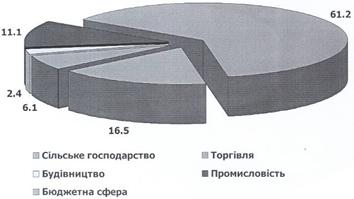 Структура зайнятих в економіці району за видами економічної діяльності станом на 01.01.2011р. у торгівлі становить - 61.2%, сільському господарстві - 16,5%, промисловості - 11,1%, бюджетній сфері - 6.1%, будівництві - 2.4% (Рис.3.4):