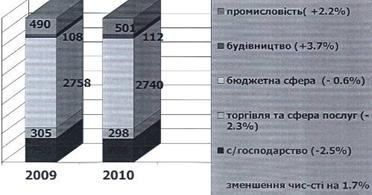 Рисунок 3.4 Структура зайнятих в економіці за видами діяльності Динаміка середньооблікової чисельності зайнятого населення в основних галузях економіки району у порівняні до 2009 року показав в загалом зменшення чисельності на 1,7% (Рис.3.5).