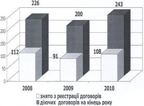 Рисунок 3.6 Динаміка реєстрації та розірвання трудових договорів підприємців з найманими особами за період 2008 - 2010рр. Структура діючих виробників сільськогосподарської продукції станом на 01.01.2011 р. показав, що більшу частку становлять фермерські господарства (Рис.3.7).