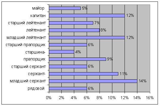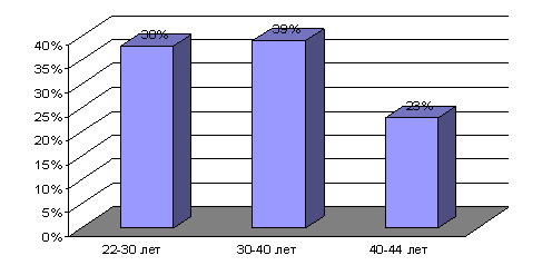 Рис.1. Возрастная характеристика выборки Средний возраст женщин сотрудников ОВД -32,5 лет . 72 % испытуемых имеют высшее образование, у 28% испытуемых средне- специальное образование. Среди испытуемых в звании рядовой -6%, младший сержант- 14%, сержант-11% , старший сержант-6%, старшина- 4%, прапорщик-9%, старший прапорщик-6%, младший лейтенант-12%, лейтенант-8%, старший лейтенант- 7%, капитан- 12% майор – 5% (рис. 2)