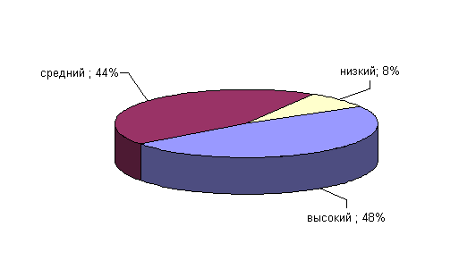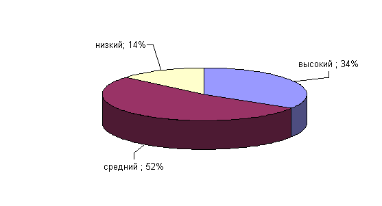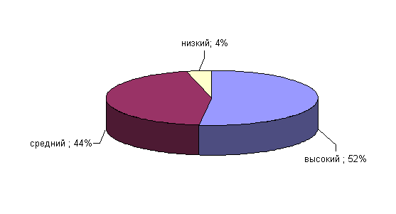 Рис.13. Показатели выраженности фактора Н у сотрудниц ОВД Как мы видим из рисунка 13, 52% имеют высокую активность в социальных контактах: они общительны, смелы, спонтанны 44% сотрудниц ОВД имеют средние баллы по данному фактору. У 4% сотрудниц ОВД низкие оценки этого фактора, которые их характеризуют их как людей застенчивых, робких, не социабельных, трудно принимающих самостоятельные решения. Результаты сотрудниц ОВД по фактору I: «жесткость – чувствительность» отражены на рисунке 14.