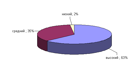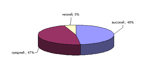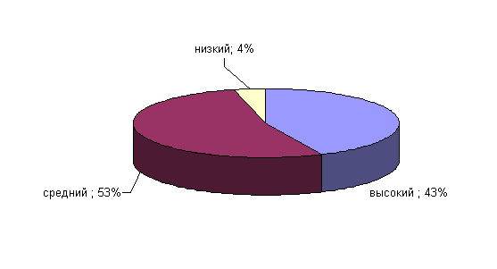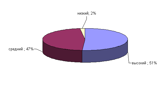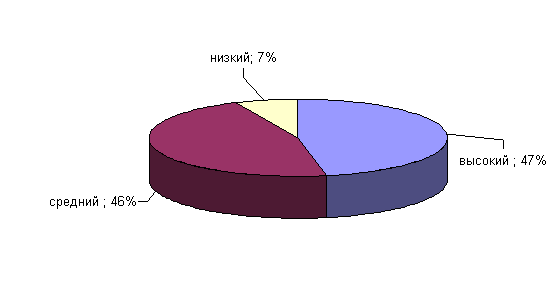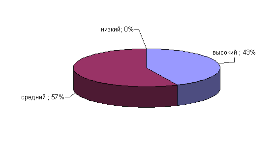 Рис.19. Показатели выраженности фактора Q1 у сотрудниц ОВД Анализ результатов показал, что у 43% сотрудниц ОВД средние результаты по данному фактору, они поглощены интеллектуальными проблемами, имеют сомнения по различным фундаментальным вопросам, скептичны и стараются вникнуть в сущность 53% сотрудниц ОВД имеют средние показатели по данному фактору. Фактор Q2 определяет степень выраженности конформизма. Результаты по данному факту у сотрудниц ОВД приведены на рисунке 20