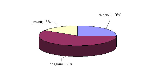 Рис.18. Показатели выраженности фактора О у сотрудниц ОВД Как мы видим из рисунка 18, 26% сотрудниц ОВД имеют высокие оценки по этому фактору. Они чувствуют свою неустойчивость, напряженность в трудных жизненных ситуациях, легко теряют присутствие духа, полны сожалений и сострадания. Низкие оценки по этому фактору, выявленные у 16% сотрудниц ОВД, характеризуют тех людей, которые могут справляться со своими неудачами , безмятежны, со спокойным настроением, невозмутимый. У большинства сотрудниц ОВД (58%) средние показатели по данному фактору. Результаты диагностики у сотрудниц ОВД по фактор Q1: «консерватизм – радикализм» приведены на рисунке 19.