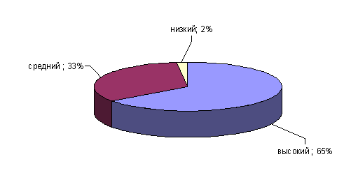 Рис.15. Показатели выраженности фактора L у сотрудниц ОВД Как мы видим из рисунка 15, у 63% сотрудниц ОВД высокие показатели по фактору, то есть, подозрительны, имеют собственное мнение, не поддаются обману. 2% сотрудниц ОВД склонны к свободе от тенденции ревности, приспособляемы, веселы, не стремится к конкуренции, заботятся о других. У 35% сотрудниц ОВД уровень подозрительности средний. Фактор М: «практичность – мечтательность» ориентирован на измерение особенностей воображения, отражающихся в реальном поведении личности, таких, как практичность, приземленность или, наоборот, некоторое «витание в облаках», романтическое отношение к жизни. Результаты его выраженности у сотрудниц ОВД приведены на рисунке 16. Высокие показатели у 43% сотрудниц ОВД по данному фактору говорят о том, что они обладают развитым воображением, погружены во внутренние потребности, заботятся о практических вопросах. У остальных средний уровень выраженности практичности.