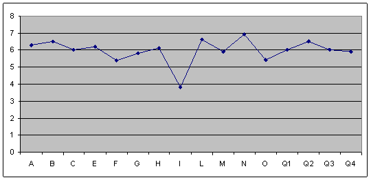 Рис.22. Показатели выраженности фактора Q4 у сотрудниц ОВД Как мы видим из рисунка 22, 32% сотрудниц ОВД имеют высокие значения по данному фактору , то есть они склонны к напряженности, возбудимости. У 63% средний уровень напряженности , характеризуются оптимальным эмоциональным тонусом и стрессоустойчивостью. 5% сотрудниц ОВД склонны к расслабленности, уравновешенности, удовлетворенности. В некоторых ситуациях их сверхудовлетворенность может вести к лени, к достижению низких результатов. Для определения профиля личности сотрудниц ОВД мы рассчитали средние показатели по всем факторам. Результаты отражены на рисунке 23. Как мы видим из рисунка 23, по большинству факторов сотрудниц ОВД значения выше среднего, кроме фактора I , что говорит о преобладании среди сотрудниц ОВД , женщин открытых (A+), общительных с высоким уровнем мыслительного развития (B+), им свойственна эмоциональная зрелость, умение управлять своими эмоциями и настроениями, склонность проявлять сдержанность, нежели расстраиваться из-за пустяков (C+), чувствительность к потребностям и чувствам других людей (F+ в сочетании с G). проницательны в отношении поступков и мотивов других людей (проницательность N+), независимы во взглядах, стремятся к самостоятельным решениям и действиям, смелы (H+), реалистичны (I-), подозрительны (L), контроль эмоций и поведения, планомерность, стремление начатое доводить до конца(Q3)