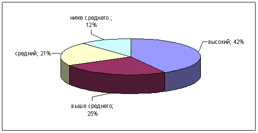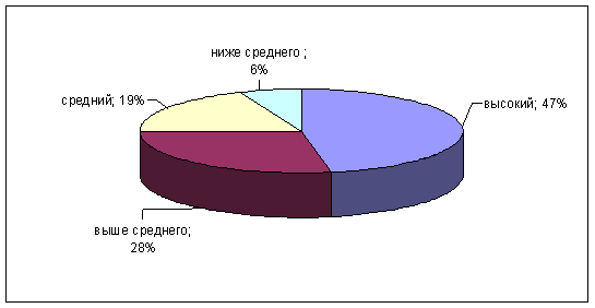 Рис. 24. Результаты сотрудниц ОВД по 1 субтесту - "Истории с завершением" По 2 субтесту - "Группы экспрессии" 47% сотрудниц ОВД имеют высокие и 28% выше среднего показатели. Данные сотрудницы способны правильно оценивать состояния, чувства, намерения людей по их невербальным проявлениям, мимике, позам, жестам. Они скорее всего, придают большое значение невербальному общению, обращают много внимания на невербальные реакции участников коммуникации. Чувствительность к невербальной экспрессии существенно усиливает способность понимать других. Средние показатели по данному субтесту у 19% сотрудниц ОВД . Низкие среднего оценки имеют 6% сотрудниц ОВД. Они плохо владеют языком телодвижений, взглядов и жестов, который раньше осваивается в онтогенезе и вызывает больше доверия, чем вербальный язык). В общении такие студенты в большей степени ориентируются на вербальное содержание сообщений. И они могут ошибаться в понимании смысла слов собеседника потому, что не учитывают (или неправильно учитывают) сопровождающие их невербальные реакции (рис.25).
