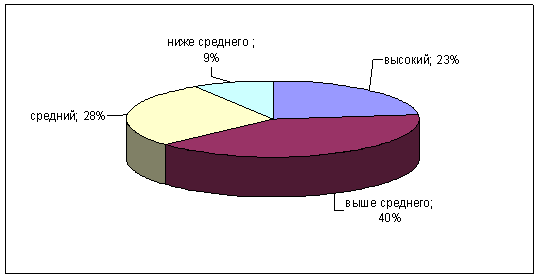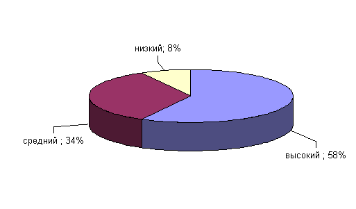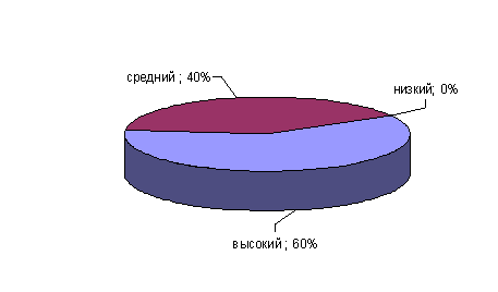 Рис.7. Показатели выраженности фактора А у сотрудниц ОВД Как мы видим из рисунка большинство сотрудниц (58%) ОВД имеют высокие баллы по данному фактору. Им свойственно склонность к добродушию, легкость в общении, эмоциональность, готовность к сотрудничеству. Данные сотрудницы хорошо запоминают события, фамилии, имена и отчества. У 34% сотрудниц ОВД средние показатели по данному фактору. 8% сотрудниц ОВД склонны к ригидности, холодности, скептицизму и отчужденности. Предпочитают работать сами, избегая компромиссов. Склонны к точности, ригидности в деятельности, личных установках. Иногда они склонны быть критически настроенным, несгибаемым, твердым, жестким. Результаты диагностики по фактору В приведены на рисунке 8. Фактор В ориентирован на измерение оперативности мышления и общего уровня вербальной культуры и эрудиции. В ходе исследования мы установили, что у 60% сотрудниц ОВД высокие показатели по данному фактору. Они быстро воспринимают и усваивают новый материал. Высокие баллы указывают на отсутствие снижения функций интеллекта в патологических состояниях. У оставшихся 40% сотрудниц ОВД средний уровень интеллекта.