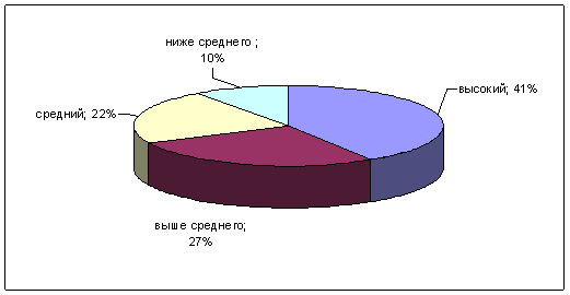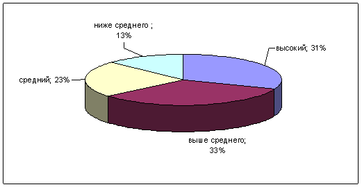 Рис.26. Результаты сотрудниц ОВД по 3 субтесту - "Вербальная экспрессия". В ходе обработки результатов по 4 субтесту - "Истории с дополнениями" мы установили, что 31% сотрудниц ОВД имеют высокие и 33% выше среднего показатели. Сотрудницы ОВД с высокими оценками по субтесту способны распознавать структуру межличностных ситуаций в динамике. Они умеют анализировать сложные ситуации взаимодействия людей, понимают логику их развития, чувствуют изменение смысла ситуации при включении в коммуникацию различных участников. Путем логических умозаключений они могут достраивать неизвестные, недостающие звенья в цепи этих взаимодействий, предсказывать, как человек поведет себя в дальнейшем, отыскивать причины определенного поведения. Успешное выполнение субтеста предполагает способность адекватно отражать цели, намерения, потребности участников коммуникации, предсказывать последствия их поведения. Кроме этого, требуется умение ориентироваться в невербальных реакциях человека, а также нормах и правилах, регулирующих поведение в обществе. Средние показатели по данному субтесту отмечены у 23% сотрудниц ОВД. Сотрудниц ОВД имеют ниже среднего оценки по субтесту 13%. Данные сотрудницы ОВД испытывают трудности в анализе ситуаций межличностного взаимодействия и, как следствие, плохо адаптируются к разного рода взаимоотношениям между людьми (семейным, деловым, дружеским и другим) (рис.28).