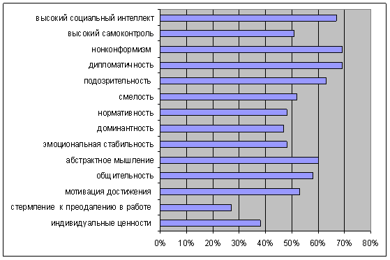 Рис.29. Выраженность у сотрудниц ОВД социального интеллекта Таким образом, сотрудницы ОВД способны извлечь максимум информации о поведении людей, понимать язык невербального общения, высказывать быстрые и точные суждения о людях, успешно прогнозировать их реакции в заданных обстоятельствах, проявлять дальновидность в отношениях с другими, что способствует их успешной социальной адаптации. Они успешные коммуникаторы, им свойственны контактность, открытость, тактичность, доброжелательность и сердечность, тенденция к психологической близости в общении. 3.1.6 Статистический анализ результатов исследования Для определения ведущих психологических особенной у сотрудниц ОВД выделим те исследуемые показатели, по которым у наибольшего количества и женщин одинаковая степень выраженности. Результаты представим в виде рисунка 30.