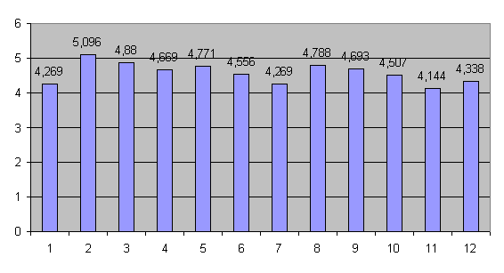 Рис.28. Результаты сотрудниц ОВД по 4 субтесту - "Истории с дополнениями". Как мы уже отмечали среди сотрудниц ОВД большинство имеют высокие показатели по субтестам, следовательно общий уровень социального интеллекта , также высокий у большинства (рис.29).