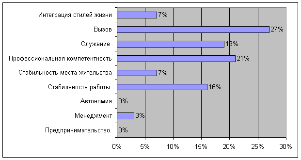 Рис.4. Распределение сотрудниц ОВД по доминирующим типам ценностей Из рисунка 4 видно, что различные группы ценностей в выборке представлены практически одинаково, с некоторым перевесом индивидуальных ценностей. В связи с этим можно утверждать, что у сотрудниц ОВД выявлено незначительное преобладание индивидуальных ценностных ориентаций, связанных с удовлетворением личных, частных целей, потребностей и установок: наслаждение, достижения, социальная власть, самоопределение и стимуляция 3.1.2 Результаты исследования карьерных ориентации с помощью методики «Якоря карьеры» Концепция «карьерных якорей» была разработана профессором менеджмента Эдгаром Шейном, профессором менеджмента, занимающимся вопросами карьеры и организационных перемен в Массачусетском технологическом институте (Massachusetts Institute of Technology, MIT). «По мнению Шейна, «карьерные якоря» — это ряд представлений сотрудника о себе, определяющих выбор карьеры. Они развиваются с течением времени и становятся все прочнее по мере накопления жизненного и рабочего опыта. По «якорям» можно предсказать, какой вид карьеры окажется для человека наиболее удовлетворительным. Шейн пишет, что его выбор метафоры якоря обусловлен тем, что нам свойственно чувствовать себя несчастными и «стремиться обратно в безопасную гавань», если оказалось, что работа не соответствует нашему образу себя. Шейн выделяет восемь самостоятельных «карьерных якорей». Первые четыре относятся к ведущему мотиву или потребности, следующие два связаны с ощущением своей компетентности, а последние два — с конкретными ценностями: ¾ автономия / независимость: потребность ощущать себя свободным и независимым; ¾ безопасность / стабильность: потребность в карьере, которая обеспечивает длительную стабильность и надежность; ¾ предпринимательское творчество: представления человека о себе опираются на его способность создать собственное предприятие; ¾ вызов: потребность преодолевать, казалось бы, непреодолимые препятствия; ¾ техническая / функциональная компетентность: потребность ¾ быть лучшим в какой-либо области; ¾ общая компетентность руководителя: люди, которые оценивают себя по способности управлять другими; ¾ служба или преданность: потребность выразить преданность любимому делу через профессиональную карьеру; ¾ образ жизни: желание интегрировать работу в повседневную жизнь». На основании данных положений была создана методика для изучения карьерных ориентаций. Результаты изучения карьерных ориентаций у сотрудниц ОВД отражены на рисунке 4 и в Приложении 2. У 21% сотрудниц ОВД выражена такая карьерная ориентация как профессиональная компетентность. Данные сотрудницы ориентированы на развитие своих способностей и навыков в областях, непосредственно связанных с их специальностью. Важнейшими критериями карьеры для них является постоянное совершенствование их опыта и знаний и признание их профессионализма. Вряд ли их заинтересует даже значительно более высокая должность, если она не связана с их профессиональными компетенциями. Так как они талантливы и любят, что к ним относятся как к знатокам своего дела, люди этой категории испытывают чувство причастности, возникающее из содержания их работы, развивают и совершенствуют свои навыки.