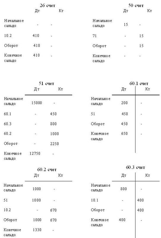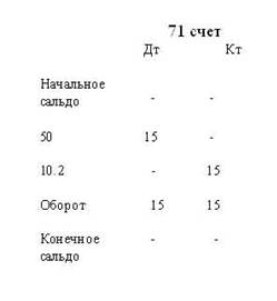 По счетам аналитического учета выведены остатки, указанные как конечное сальдо: по счету 10.1 - 1900, счету 10.2 - 4475, счету 26 - 410, счету 50-0, счету 51 - 12750, счету 60.1 - 650, счету 60.2 - 1330, счету 60.3 - 400, счету 71 - 0. Составим оборотную ведомость (таблица 2). Таблица 2 - Оборотно-сальдовая ведомость 50 счет