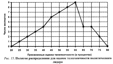 Если просто соединить между собой точки, соответствующие абсолютным или относительным частотам (ось ординат) для середин интервалов, мы получим так называемый полигон распределения. Эта операция, разумеется, будет иметь какой-то смысл лишь для количественных переменных, которые мы в принципе можем представить себе как непрерывные. На рисунке 2 изображен полигон распределения для экспертных оценок телегеничности политического лидера (50 экспертов оценивали политика в процентах по отношению к некоторому абсолютному эталону телегеничности).