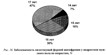 Еще один популярный способ графического представления, обычно используемый для качественных данных (т. е. для номинальных или ординальных измерений),- это круговая диаграмма. Каждый сектор круговой диаграммы представляет дискретную категорию переменной. Величина сектора пропорциональна частоте категории для данной выборки. На рисунке 3 приведена круговая диаграмма, иллюстрирующая распределение подростков, страдающих вялотекущей формой шизофрении, по возрасту на момент начала («дебюта») заболевания.