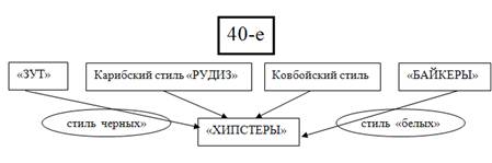 Рис. Таким образом, в конце сороковых годов окончательно оформились два стиля, определявших впоследствии лицо молодежных субкультур - карибский, стиль «черных» городских субкультур как и в Америке, так и в Великобритании; «вест» или «ковбойский», определивший пути «альтернативного» поиска большинства белых представителей молодежных субкультур. В развитии этих двух стилей выделились две тенденции - Dressing up и Dressing down. Первый характерен преимущественно для молодежных субкультур национальных меньшинств, и некоторых «белых», представляющих «рабочий» класс. В сороковые годы появляется такая черная субкультура, как «зут» - ярчайший пример Dressing up. Вторая тенденция для «люмпенских» субкультур подчеркивала, прежде всего, свою исключительность и самодостаточность: появляются байкеры - самая обособленная и замкнутая из молодежных субкультур, и может поэтому самая «живучая». На границе «ковбойского» и «карибского» стилей, параллельно им существовавших субкультурных полукриминальных миров негритянских гетто, белых рабочих кварталов и злачных мест, cкладывается мир хипстеров - тот «альтернативный» котел, из которого вышли немногим позднее все современные молодежные субкультуры. 2.2«Пороховой погреб» пятидесятых В 50-е годы по обе стороны Атлантического океана начала складываться массовая молодежная культура, появляется такое понятие как «тинэйджер». Подростки начинают делиться на две группы: (1) подростков, убаюканных возможностью потребления, запуганных холодной войной, следовавших моде своего времени (моде взрослых) и (2) подростков, которые стали образцами нового молодежного стиля, стиля улиц, их героями становятся Марлон Брандо, Джемс Дин, Элвис Пресли, подростки, которые выплескивали свои эмоции в переворотах рок-н-ролла, ночи напролет курили, спорили о битниках и экзистенциализме в джазовых погребках. Эти подростки начинают следовать моде молодежных субкультур 50-х годов, которые стали предвестниками последующих событий в развитии массовой молодежной культуры. Если к концу 40-х годов субкультуры слились в массовую культуру хипстеров, то в 50-е начинается процесс рассыпания субкультур, и появляются: «битники», «тедди бойз», «модернисты», «кантри», «рокабилли», «ton up boys», «серферы». 2.2.1Битники (BEATNIK). Разбитое поколение (BEAT GENERATION), (США) «То, что в 50-е было известно под словом "бит", десятилетием раньше звалось словом "хип"». Дословно «бит» переводится на русский язык как «разбитый», «раздавленный». Кроме того, удар, ритм в джазе тоже называют «бит». К середине 50-х годов ХХ столетия уже существовала и атомная и водородные бомбы, ядерное уничтожение становилось для человечества реальной возможностью. Поколение «бит» оказалось первым поколением молодых, которое, живя в обстановке мира ощущало постоянную угрозу смерти. Отсюда их стремление бежать от общества, от той техники, которая несла гибель. И они бежали. Истинное наслаждение битникам доставляло мчаться с бешеной скоростью на машине. Постепенно вырисовывается образ Дороги, Великого Путешествия - первая карта автостопа. Протестом против тепличного, стандартного счастья индустриальной городской американской цевилизации явился роман Джека Керуака «На дороге» (1957 года). Это не просто роман, а пропаганда мировоззрения, евангелие битничества. Содержание романа сводится к описан