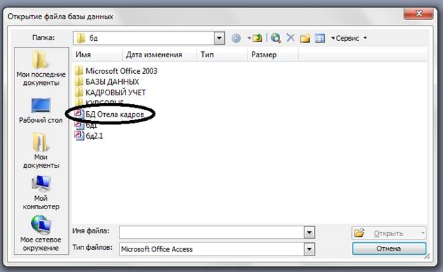 Курсовая работа: База данных отдела кадровКурсовая работа: База данных отдела кадровМИНИСТЕРСТВО ОБРАЗОВАНИЯ И НАУКИ РОССИЙСКОЙ ФЕДЕРАЦИИ Федеральное государственное автономное образовательное учреждение высшего профессионального образования «ДАЛЬНЕВОСТОЧНЫЙ ФЕДЕРАЛЬНЫЙ УНИВЕРСИТЕТ» ФИЛИАЛ в г. ПЕТРОПАВЛОВСКЕ-КАМЧАТСКОМ Специальность 080801 «Прикладная информатика (по областям)» Кафедра «Естественнонаучных и информационных дисциплин» КУРСОВАЯ РАБОТА по дисциплине «Базы данных» на тему «База данных отдела кадров» Студент группы ПИЭД-09 А.М. Маликова Научный руководитель ст. преподаватель С.А. Иваненко Петропавловск-Камчатский 2011 Содержание Введение 1 Обследование предметной области 2 Концептуальное проектирование 2.2 Перечень атрибутов 3 Инфологическое проектирование БД 3.1 Модель «сущность-связь» 4 Реляционная модель БД 4.2 Нормализация отношений 5 Физическое проектирование БД 5.1 Состав таблиц БД 5.3 Экранные формы 6 Инструкция по использованию БД 6.2 Экранные формы Заключение Список используемых источников Введение Базы данных — это совокупность структур, предназначенных для хранения больших объемов информации и программных модулей, осуществляющих управление данными, их выборку, сортировку и другие подобные действия. Информация базы данных хранится в одной или нескольких таблицах. Любая таблица с данными состоит из набора однотипных записей, расположенных друг за другом. Они представляют собой строки таблицы, которые можно добавлять, удалять или изменять. Каждая запись является набором именованных полей, или ячеек, которые могут хранить самую разнообразную информацию, начиная от даты рождения и заканчивая подробным описанием кулинарного рецепта. Однотипные поля разных записей образуют столбец таблицы. Создав одну таблицу, вы уже получаете полноценную базу данных. Однако в реальной жизни структуры баз данных, а соответственно и способы их создания, намного сложнее. В последние годы на первый план выдвигается новая отрасль - информационная индустрия, связанная с производством технических средств, методов, технологий для производства новых знаний. Эта индустрия тесно связана с развитием компьютерных технологий. В информационном обществе доминирует производство информационного продукта, а материальный продукт становится более информационно емким. Изменятся весь уклад жизни, система ценностей: возрастает значимость культурного досуга, возрастает спрос на знания, от человека требуется способность к интеллектуальному труду и творчеству. В результате появились противоречия между ограниченными возможностями человека по восприятию и переработке информации и существующими массивами хранящейся и передаваемой информации. Возникло большое число избыточной информации, в которой иногда трудно сориентироваться и выбрать нужные сведения. Для решения подобных проблем применяются автоматизированные базы данных. Они стали неотъемлемой частью практически всех компьютерных систем - от отрасли до отдельного предприятия. За последние несколько лет вырос уровень потребительских качеств систем управления базами данных (СУБД): разнообразие поддерживаемых функций, удобный для пользователя интерфейс, сопряжение с программными продуктами, в частности с другими СУБД, возможности для работы в сети и т.д. СУБД позв