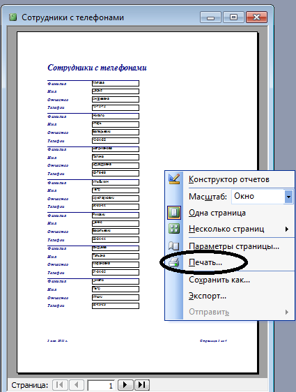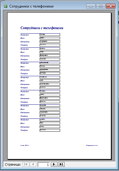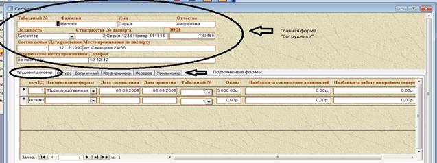 Запросы — это объект базы данных, который служит для извлечения данных из таблиц и предоставления их пользователю в удобном виде. Особенность запросов состоит в том, что они черпают данные из базовых таблиц и создают на их основе временную таблицу. Все запросы делятся на две группы: запросы-выборки, запросы-действия. Запросы-выборки осуществляют выборку данных из таблиц в соответствии с заданными условиями. Запросы-действия позволяют модифицировать данные в таблицах: удалять, обновлять, добавлять записи. В данной БД представлены следующие запросы: 1. Структурное подразделение, – какие и сколько работников работает в данном подразделение. Нужное подразделение будет вводиться с клавиатуры вручную. 2. Текучесть кадров – какие сотрудники какого числа были приняты и уволены. 3. Отпуск – в данном запросе будет просматриваться, какие сотрудники уже были в отпуске. 4. Список сотрудников с номерами телефонов. 5. Список сотрудников по должностям. 6. Список сотрудников по структурному подразделению. 7. Поиск сотрудников по табельному номеру. 8. Поиск сотрудников по фамилии. Так же в данной БД представлены запросы-действия на добавления записей в таблицы приказы по личному составу и производственные приказы, например при введении данных в таблицу трудовой договор пункты дата составления и ключТД будут вводиться в таблицу приказы по личному составу. 5.3 Экранные формыФорма в БД - это структурированное окно, которое можно представить так, чтобы оно повторяло форму бланка. Формы создаются из набора отдельных элементов управления. Источником данных для формы являются записи таблицы или запроса. Форма предоставляет возможности для: 1. Ввода и просмотра информации базы данных 2. Изменения данных 3. Печати 4. Создания сообщений. В данной БД представлены следующие формы: 1. Сотрудники 2. Трудовой договор 3. Больничный 4. Увольнение 5. Командировка 6. Перевод 7. Увольнение. Формы 2-7 являются подчиненными для формы 1. 5.4 ОтчетыОтчет - это объект базы данных, который предназначен для вывода информации из баз данных, прежде всего на печать. Отчеты позволяют выбрать из баз данных нужную пользователю информацию, оформить ее в виде документа, перед выводом на печать просмотреть на экране. Источником данных для отчета может служить таблица или запрос. Кроме данных, полученных из таблиц, в отчете могут отображаться вычисляемые поля, например, итоговые суммы. В данной БД представлены следующие отчеты: 1. Сотрудники с телефонами - показывает список сотрудников (их фамилию, имя и отчество) с номерами телефонов. 2. Текучесть кадров - показывает какие сотрудники какого числа были приняты и уволены. 6