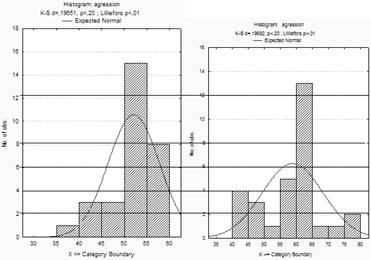 Следовательно, на основании результатов описательной статистики можно сделать вывод о том, что большинство подростков из неблагополучных семей склонны к нарушению норм и правил, отрицанию общепринятых ценностей и моделей поведения, демонстрируют ярко выраженные нонконформистские тенденции. Небольшой процент (10% и 6,67%) склонны к делинквентному поведению, 3,33% испытуемых категории СОП имеют алкогольную или никотиновую зависимости. 23,3% благополучных подростков (как и 23,33% с девиантным поведением) не склонны к проявлению агрессии, у 50% агрессивность проявляется в ответ на встречную агрессию (против 3,33% подростков категории СОП), 26,67% благополучных подростков и 16,67% неблагополучных склонны к периодическим вспышкам агрессии, чаще косвенной и вербальной, раздражении и обиде (см. диаграммы 3-4).