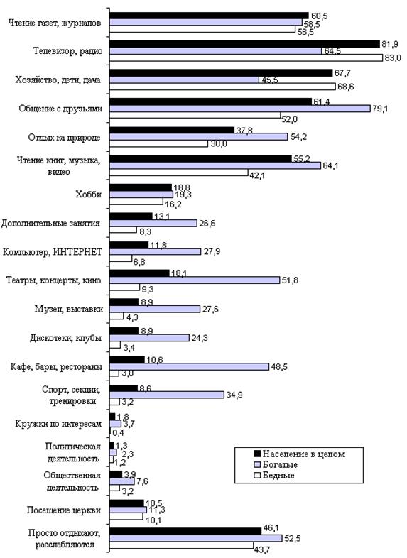 Курсовая работа: Досуг богатых и бедныхКурсовая работа: Досуг богатых и бедныхФедеральное агентство по образованию РФ ГОУ ВПО Саратовский государственный технический университет Институт социального и производственного менеджмента Факультет управления социальными системами Кафедра менеджмента туристического бизнеса Курсовая работа По дисциплине Социология досуга на тему: «Досуг богатых и бедных» Выполнила: ст. каф. МТБ гр. СКС-31 з/о Годжаева Э.Б Проверила: Отнюкова М.С. Саратов 2009 Содержание Введение Глава 1 Досуг богатых и бедных 1.1 Досуг бедных 1.2 Досуг богатых 1.3 Туризм как показатель социального статуса Глава 2 Исследование досуговых предпочтений богатых и бедных Заключение Список использованных источников Приложение Введение В наступившие тяжелые времена людям стало трудно выбирать, как провести досуг. Кризис заставляет людей работать в два-три раза больше за ту же заработную плату, если не меньше. Человеку совсем не остается времени на себя. Он устает и все чаще досуг принимает пассивную форму. Как бы сказал Лес Хейвуд: досуг стал пониматься как остаточное время. Тяжелая экономическая ситуация в стране резко выделила два полюса, две страты: богатых и бедных. Но в любые времена человеку свойственно отдыхать. Но как он будет проводить свое время, зависит от многих показателей, в том числе и от уровня жизни. Данная тема актуальна в наше неспокойное время. Кризис - преступность растет. Народ необходимо чем-то занять, а то получится как в поговорке: все пороки от безделья. На что направить эмоции и энергию людей, удрученных сложившейся ситуацией? Целью данной работы является исследование возможностей для проведения досуга полярными стратами, а также их досуговые предпочтения, т.е. какие у людей есть возможности для проведения досуга и как они хотят провести его на самом деле. Объектом данной работы являются богатые и бедные люди. Предметом – досуг данных социальных страт. Для решения цели поставлены следующие задачи: понять из чего восходят понятия богатые и бедные, т.е. определить кто такие бедные, и кто такие богатые, рассмотреть, как проводят досуг данные категории людей, рассмотреть туризм как показатель социального статуса. Во второй половине работы будет проведено конкретное исследование, на основании которого будут выделены категории людей и их досуговые предпочтения и реальные возможности. Глава 1 Досуг богатых и бедных Для начала необходимо определить кто такие бедные, и кто такие богатые. В этом нам поможет понятие социальной стратификации. Социальная стратификация – это дифференциация некоторой данной совокупности людей (населения) на классы и группы в иерархическом ранге. Она находит выражение в существовании высших и низших слоев. Ее основа и сущность – в неравномерном распределении прав и привилегий, ответственности и обязанности, наличии или отсутствии социальных ценностей, власти и влияния среди членов общества[1]. Социальная стратификация - это совокупность расположенных в вертикальном порядке социальных слоев, в частности, бедных, зажиточных, богатых. Неравенство и бедность — понятия, тесно связанные с социальной стратификацией[2]. Стратификация основывается на неравенстве. Бедные и богатые не равны по своим доходам, престижу своего рода деятельности, политическому весу. Иными словами, у них