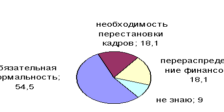 Одновременно в этом же бланке по каждому из качеств рассчитывается средний балл степени проявления этого качества у аттестуемого, где Пср - средняя оценка степени проявления качеств у аттестуемого; П1,5. П0,5 - степень проявления качеств у аттестуемого по оценке экспертов; n1,5. n0,5 - количество экспертов, отнесших качество к степени его проявления у аттестуемого к тому или иному баллу оценки; n - общее количество экспертов. Затем по каждому качеству определяется средневзвешенный балл по формуле: К = Зср * Пср, где К - качество. Далее путем суммирования средневзвешенных баллов по всем качествам определяется итоговый балл оценки аттестуемого. Итоговую оценку комиссия сравнивает с эталоном. Расчет эталона производится следующим образом: сумма баллов по всем 10 качествам (10+9+8+7+6+5+4+3+2+1 = 57) умножается на 1,5 (коэффициент степени проявления качества, если оно проявляется всегда), или на 1,0 (если оно проявляется в большинстве случаев), или же на 0,5 (если качество присутствует иногда). В итоге получаем следующие результаты: 57 х 1,5 = 85,5; 57 х 1,0 = 57,0; 57 X 0,5 = 28,5. Таким образом, в первом случае, если оценка работника составляет более 85 баллов, формулируют вывод о его повышении или включении в состав резерва на выдвижение. Во втором случае, если оценка составит от 57 до 85 баллов, делают заключение о соответствии занимаемой должности. В третьем случае, если оценка составляет ниже 28 баллов, фиксируют вывод о том, что работник не соответствует занимаемой должности. При этом весьма ценно и то обстоятельство, что детальный анализ оценок экспертов по качествам может помочь определить для каждого работника конкретные направления совершенствования его деятельности. Анализ процедуры проведения оценки в УПФР и анализ литературы по проблеме определили необходимость проведения опроса работников УПФР. В исследование принимали участие 16 человек: 5 человек - руководители высшего и среднего звена, 2 человека - члены аттестационной комиссии и 9 человек - рядовые рабочие, аттестуемые. Исследование проводилось в виде анкетирования (Приложение 6). Назначение аттестации определяется исследуемыми как обязательная необходимость, необходимость перестановки кадров, возможность перераспределения финансов предприятия. Ни один из испытуемых не воспринимает аттестацию как возможность повышения профессиональных качеств и/или продвижение по карьерной лестнице (рис.1).