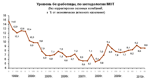Рисунок 2 – Динамика основных показателей реальных доходов населения в России в 2007-2009 г. [29] Так, в 2009г. объем денежных доходов населения сложился в размере 28388,8 млрд.рублей и увеличился на 12,5% по сравнению с 2008 годом. Население израсходовало средств на покупку товаров и оплату услуг 19635,6 млрд.рублей, что на 5,0% больше, чем в 2008 году. Сбережения за этот период составили 5602,3 млрд.рублей, что на 67,3% больше, чем в предыдущем году [29]. Что касается размера заработной платы, то для ее регулирования, а также для определения размеров различных социальных пособий, применяется минимальный размер оплаты труда (МРОТ). За последние пять данный показатель существенно вырос: с 720 руб. в 2005 году до 4330 руб. в настоящее время [21]. 2.1.2 Динамика занятостиПо данным Госкомстата России [19], численность экономически активного населения в возрасте 15-72 лет (занятые + безработные) в марте 2010г. составила 74,6 млн.человек, или более 52% от общей численности населения страны. По сравнению с февралем 2010г. численность безработных практически осталась на том же уровне. Уровень безработицы, исчисленный как отношение численности безработных к численности экономически активного населения, в марте 2010г. составил 8,6% (рисунок 3).