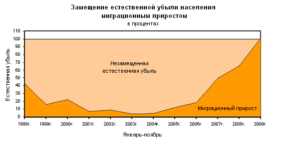 На основании представленных данных можно сделать вывод, что: - ситуации жилищные условия россиян медленно, но верно улучшаются; - субсидии / социальную поддержку по оплате жилого помещения и коммунальных услуг стало получать меньшее количество людей, но при этом размер самих выплат увеличился. 2.1.4 Демографическая ситуацияПо оценке Госкомстата России [29], численность постоянного населения Российской Федерации на 1 декабря 2009г. составила 141,9 млн.человек и с начала года увеличилась на 3,2 тыс.человек, или на 0,002% (на соответствующую дату предыдущего года наблюдалось сокращение численности населения на 117,4 тыс.человек, или на 0,083%). Естественная убыль населения в январе-ноябре 2009г. уменьшилась по сравнению с соответствующим периодом 2008г. на 113,0 тыс.человек. Увеличившийся миграционный прирост полностью компенсировал численные потери населения и превысил их на 1,4% (рисунок 4, таблица 6).