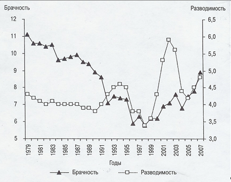 Небольшое отступление. Развод часто оценивается аналитиками как трагедия, свидетельство дезорганизации семьи. Но необходимо отметить, что роль разводов на сегодняшний день неоднозначна. Можно привести несколько примеров, когда развод несет собой положительные изменения как для супругов, так и для общества. Один из таких примеров – повторный брак. Развод, по выражению У. Гуда, отличается от других способов снятия напряжения тем, что женщина может найти другого мужа. В некоторой степени это объясняет решительность женщины как инициатора развода. Женщина успешно реализует возможность повторного вступления в брак, тем самым время состояния в браке на протяжении прокреационного периода увеличивается, то есть повышается вероятность появления детей от повторного брака. Этот факт не может не сказаться на динамике рождаемости. Напротив, если есть существенные ограничения, накладываемые на развод, то получает распространение раздельное проживание формально состоящих в браке супругов, снижается вероятность того, что будут рождены дети в повторных союзах (например, в Италии и Испании, где расторжению брака препятствуют традиции).