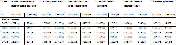 *Знак (-) означает естественную убыль населения. Негативной особенностью России является тот факт, что в результате демографического перехода рождаемость упала до уровня развитых стран, в то время как смертность достигла уровня развивающихся. По мнению некоторых демографов, падение смертности в результате развития здравоохранения компенсировалось с 1960-х гг. ростом алкогольной смертности. Алкогольная смертность в России (600—700 тыс. человек в год) связана с самым высоким в мире уровнем потребления легальных и нелегальных алкогольных напитков. Она покрывает собой большую часть разрыва между рождаемостью и смертностью, обуславливающего депопуляцию России. Этому мнению никак не противоречит мнение некоторых других демографов, которые считают, что высокая смертность связана с незавершенностью процессов модернизации России, включая социокультурный аспект. В частности, забота о собственном здоровье не является высокой ценностью в рамках менталитета существенной части населения, что предопределяет высокую алкоголизацию, смертность от несчастных случаев (включая ДТП), аномальную распространённость ряда болезней и др. По данным Переписи населения 2002 года численность населения России с 1989 по 2002 упала на 1,8 млн. Каждую минуту в России рождалось 3 человека, а умирало - 4. Общемировая тенденция была противоположна: отношение количества рождений к смертям равно 2,6. Особенно велика смертность у российских мужчин, средняя продолжительность жизни которых составляла 58, 7 года, что связано, в частности, с высоким уровнем потребления крепких алкогольных напитков, большим количеством несчастных случаев, убийств и самоубийств. Продолжительность жизни женщин была значительно выше — 71,9 года. Согласно ежегодному Докладу Фонда ООН в области народонаселения за 2004 год, в России продолжался демографический кризис. В 1990-х годах смертность стала в 1,5 раза превышать рождаемость. К концу 1990-х годов темпы естественной убыли населения превысили 900 тыс. человек. Начиная с 2001 года происходило почти постоянное сокращение естественной убыли населения (с 959 тыс. человек в 2000 году до 249 тыс. человек в 2009 году). С 2004 года начался устойчивый рост миграционного притока в Россию, достигшего к 2009 году 247 тыс. человек. 2.2 Основные тенденции смертности Начало XX века (до 1940-х годов) — высокая смертность, в том числе младенческая и детская, преобладание инфекционных заболеваний среди причин смерти, повышенная мужская смертность в интервалах от 40-44 до 60-64 лет. Ожидаемая продолжительность жизни — 30-40 лет. Резкие снижения ожидаемой продолжительности жизни отмечены в периоды Гражданской и Великой Отечественной войн, а также в начале 1930-х годов. В 50-х – 60-х г.г. отмечено резкое снижение коэффициента младенческой смертности и, как следствие, огромный прирост ожидаемой продолжительности жизни: 23,55 года у мужчин, 26,77 года у женщин. Одна из основных причин — распространение антибиотиков (см. табл. 1). В целом до 1965 года ожидаемая продолжительность жизни растёт. С 1965 года — рост смертности среди взрослых (особенно мужчин в активных возрастах) и медленное снижение смертности в возрастах моложе 15 лет; ожидаемая продолжительность жизни снижается с каждым годом; продолжается снижение младенческой смертности. Начало 1990-х годов. Рост неестественной смертности, ускорение падения ожид