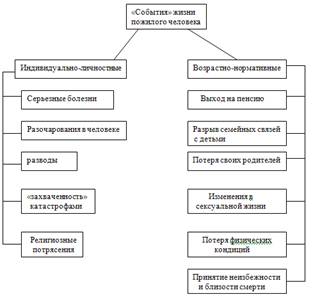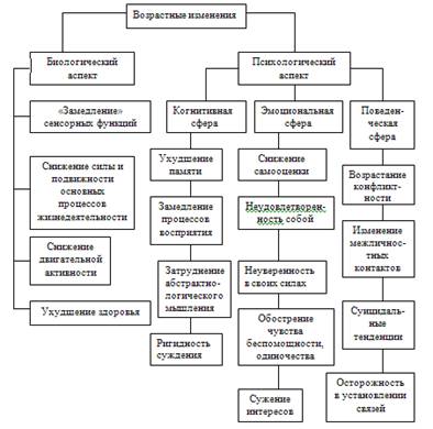 Схема1. Взаимодействие человека и социального окружения Авторы полагают, что именно возрастно-нормативные события задают критерий для периодизации жизни, а также периодизации возрастных изменений. На возрастные изменения пожилого человека существенное влияние оказывает биологическая и психосоциальная история предшествующих периодов жизни. Среди общих признаков старения наиболее общим свойством является «замедления», охватывающие как большинство сенсорных функций – зрение, слух, вкус, осязание, так и более сложные – психомоторики, восприятия нового, запоминания, всего поведения человека, включая способность к адаптации в меняющихся условиях. Однако общие проявления старения в любой из функциональных систем организма сказываются в виде возрастного снижения силы и подвижности основных процессов жизнедеятельности. Внешние проявления особенно демонстративны на примере двигательной активности в старости. Помимо биологических изменений в старости, особую роль играют и психологические. Они проявляются в когнитивной, эмоциональной и психологической сферах. Из геронтологической литературы известно, что с возрастом снижается эффективность когнитивных функций, прежде всего восприятия и памяти. Авторы указывают, что отражением «нормального старения» являются: ухудшение памяти, замедление процессов восприятия и затруднение «полёта мысли». Относительно старения эмоциональной сферы среди учёных нет единого мнения. С одной стороны, выявлены биохимические сдвиги, располагающие к частому проявлению депрессивного и тревожного состояния, с другой – не обнаружено существенного изменения, хотя и подчёркивается полиморфизм эмоциональной характеристики. На уровне личности изменения эмоциональной сферы наблюдаются в существенном снижении самооценки, неудовлетворённости собой, неуверенности в своих силах, обостряется чувство беспомощности, одиночества, происходит сужение интересов. В поведенческой сфере по мере старения наблюдается возрастание готовности к конфликтам, качественное изменение межличностных контактов/ возможны суицидальные тенденции в поведении, осторожность в установлении новых социальных связей.