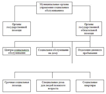 Схема2. Возрастные изменения у пожилых людей Таким образом, увеличение удельного веса пожилых людей в составе населения, изменение социального статуса человека в старости, прекращением или ограничением трудовой деятельности, трансформацией ценностных ориентиров, самого образа жизни и общения, а также возникновением различных затруднений как в социально-бытовой, так и в психологической адаптации к новым условиям, диктует необходимость выработки и реализации специфических подходов, форм и методов социальной работы с пожилыми людьми. Как правило, программы социальной помощи, реабилитации, коррекции разрабатываются в зависимости от принадлежности к той или иной категории пожилых людей. С этим же связано и использование различных принципов, методов, приемов работы с клиентом[14]. Содержание работы с пожилыми людьми включает в себя вопросы, связанные со сферой здоровья, психосоциального благополучия и социальных услуг. Рост численности пожилого населения влияет на основные тенденции в изменении форм социальной работы, характера технологического процесса совершенствования помощи престарелым. Основные принципы работы с пожилыми людьми являются уважение и интерес к личности клиента, акцент на нужности и полезности его опыта и знаний окружающим людям. Важно воспринимать пожилого человека не только в качестве объекта, но и субъекта социальной работы. Это должно помочь найти и развить их внутренние резервы, способствующие самореализации, самоподдержке исамозащите. Большую роль играет при этом профессиональная компетентность специалиста по социальной работе, включающая в себя знания геронтологических и психологических особенностей возраста, учет принадлежности клиента к той или иной социальной группе. 1.2 Формы организации социального обслуживания людей пожилого возраста Социальное обслуживание является важнейшим звеном системы социального обеспечения. В нашей стране оно регулируется, прежде всего, Федеральными Законами «Об основах социального обслуживания населения в Российской Федерации» (1995 год), «О социальном обслуживании граждан пожилого возраста и инвалидов» (1995 год). Согласно Федеральному Закону «Об основах социального обслуживания населения в РФ»[15], «социальное обслуживание представляет собой деятельность социальных служб по социальной поддержке, оказанию социально-бытовых, социально-медицинских, психолого-педагогических, социально-правовых услуг и материальной помощи, проведению социальной адаптации и реабилитации граждан, находящихся в трудной жизненной ситуации». Социальное обслуживание людей пожилого возраста осуществляется в соответствии с этическими принципами Международной организации труда[16]: Достоинство личности – право на достойное обращение, лечение, социальную помощь и поддержку. Свобода выбора – каждое лицо преклонного возраста имеет право выбора между содержанием на дому и проживанием в приюте, временным или окончательным. Координация помощи – помощь, оказываемая различными социальными органами, должна носить деятельностный, координированный и последовательный характер. Индивидуализация помощи – помощь оказывается прежде всего самому гражданину преклонного возраста, учитывая его окружение. Ликвидация разрыва между санитарным и социальным уходом – при приоритет