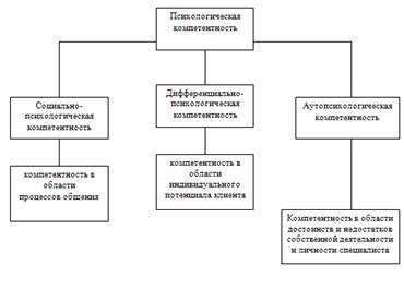 Схема 1.социально-психологическая компетентность – это компетентность специалистов в области профессионального общения. 2.дифференциальная компетентность – это компетентность в области мотивов, способностей, потребностей и так далее, (потенциала) клиента. 3. аутопсихологическая компетентность – это компетентность специалиста в области достоинств и недостатков собственной деятельности и личности. Содержание психологической компетентности специалиста в научной литературе представлено через рассмотрение профессиональных знаний, умений, способностей и профессионально-важных качеств. Необходимо отметить, что в литературе нет единого мнения относительно содержания психологической компетентности, то есть ее элементов, а на особенности ее описания серьезное влияние оказывает понимание исследователями феномена компетентности. Поэтому отдельные элементы психологической компетентности часто оказываются «рассеянными» по другим составляющим профессиональной структуры. Так можно выделить направление, где определение профессиональной компетентности опирается на квалификационные характеристики, поэтому структурные элементы компетентности в общении раскрываются в основном через умения специалистов (Л.А.Аухадеева, Р.К.Бикмухаметов[36] и другие). Л.А.Аухадеева и Р.К.Бикмухаметов, исходя из функций общения как коммуникативной деятельности, выделяют основные группы коммуникативных умений: умения, направленные на решение информационно содержательных аспектов общения; Умения, направленные на построение общей стратегии общения; умения, направленные на восприятие партнерами друг друга; и интегративные коммуникативные умения: умение ориентироваться в ситуации общения и пользоваться различными средствами общения ; умение управлять своим поведением; умение слушать и понимать партнера. Значительная часть работ посвящена коммуникативным умениям как самостоятельному предмету рассмотрения, поскольку в социальной деятельности нельзя достичь больших результатов, овладев лишь знаниями по специальности ( М.Е.Дашкин[37], Т.В.Никольская[38] и другие). В структуру этой деятельности входят различные умения, и, прежде всего коммуникативные. Именно они, будучи внешним выражением деятельности, являются существенным показателем успешности специалиста. Говоря непосредственно о коммуникативных умениях, пишет М.Е.Дашкин, следует отметить, что под ними нужно понимать совокупность интеллектуально-коммуникативных действий, позволяющих активно включиться в социально-регулируемый и целенаправленный процесс профессионального и социального взаимодействия. Коммуникативные умения как необходимый компонент деятельности социального работника рассмотрены им в контексте содержания и структуры и включают вербальные и невербальные. Рассматривая вопросы формирования коммуникативных умений у будущих специалистов по социальной работе, Т.В.Никольская считает, что процесс подготовки будущих специалистов должен включать в себя развитие следующих коммуникативных умений: 1. контроль и самоконтроль в общении; 2. организация и управление коммуникативным процессом в любой приемлемой для клиента форме; 3. учет особенностей клиента во взаимоотношениях с ним, в зависимости от его социального статуса, мотивов деятельности, круга интересов, обр