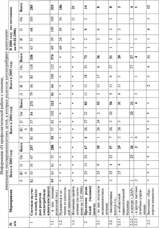 Россияне "за" новую антиалкогольную кампанию 11 августа 2009 г. Всероссийский центр изучения общественного мнения (ВЦИОМ) представляет данные о том, насколько широкой поддержкой пользовалась бы новая антиалкогольная кампания, в случае если было бы принято решение о ее проведении, какие меры россияне поддержали бы более всего, а также сколько сограждан слышало об инициативе Дмитрия Медведева о принятии государственной программы по борьбе с алкоголизмом и другими вредными привычками. Двум третям россиян (66%) известно об инициативе Дмитрия Медведва по принятию государственной программы по борьбе с алкоголизмом и другими вредными привычками. Чем старше респонденты, тем больше им известно о такой инициативе президента (53% - среди 18-24-летних, 65% - 25-34-летних, 67% - 35-44-летних, 70% - 45-59-летних, 71% - среди тех, кому 60 лет и старше). Большинство россиян (65%) поддержали бы новую антиалкогольную кампанию. Не поддержали бы такие меры российских властей лишь четверть опрошенных россиян (25%). Женщины более склонны поддерживать проведение антиалкогольной компании в нашей стране.71% россиянок высказываются в поддержку таких действий, среди мужчин сторонников борьбы с алкоголизмом набирается чуть более половины (57%). Треть россиян (32%) и почти каждая пятая россиянка (18%) - против антиалкогольной кампании в своем государстве. Чем более обеспечены респонденты, тем чаще они высказываются в поддержку проведения новой антиалкогольной кампании (сторонники составляют: 70% в группе с высокой самооценкой собственного материального положения и 62% среди малообеспеченных россиян). В рейтинге наиболее популярных мер по борьбе с алкоголизмом лидируют: запрет на продажу алкоголя молодежи до 21 года (63%), запрет рекламы любого вида алкоголя, в т. ч. и слабоалкогольных напитков (57%), пропаганда здорового, трезвого образа жизни (47%). В "середнячках" оказываются: введение уголовной ответственности за распитие спиртных напитков и появление в состоянии алкогольного опьянения в общественных местах (34%), ограничение продажи алкоголя в утреннее время (31%), принудительное лечение от алкоголизма (29%), развитие современных медицинских методов лечения алкоголизма, в том числе нетрадиционных (25%), повышение цен на алкогольную продукцию (19%). Замыкают список: организация обществ трезвости, анонимных алкоголиков (15%) и введение запрета на производство и продажу спиртных напитков (ведение "сухого закона") (10%). алкоголизм реабилитационная работа семья Только 3% опрошенных считают, что вообще ничего не надо предпринимать, "государство не должно в это вмешиваться". Женщины и менее обеспеченные россияне настроены более строго в отношении проблемы алкоголизма: поддерживают большее число (и в большей степени) предложений по борьбе с этой болезнью. Лишь два метода малообеспеченные россияне поддерживают реже, чем их более обеспеченные сограждане - повышение цен на алкогольную продукцию и пропаганда здорового, трезвого образа жизни. (Инициативный всероссийский опрос ВЦИОМ проведён 18-19 июля 2009 г. Опрошено 1600 человек в 140 населенных пунктах в 42 областях, краях и республиках России. Статистическая погрешность не превышает 3,4%). /22/ 1.2 Медико-психические особенности алкоголизмаАлкоголизм - заболевание с хроническим течением, в основе которого лежит пристрастие к этиловому спирту. В социальном плане алког