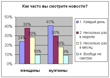Мы можем проследить, что в 16–18 лет наибольшей популярностью пользуются музыкальные передачи и интеллектуальные игры. В возрасте 16–18 лет новости не смотрит почти никто. Мы не можем распространять эти данные на всю генеральную совокупность, т. к. это результаты пилотажного исследования, и данные могут быть нерепрезентативны. Но, тем не менее, можно сделать вывод, что молодежь 16–18 лет – наиболее аполитичная группа, т. к. в этом возрасте молодые люди еще не являются избирателями. Это подтверждает ответ и на другой вопрос: «Как часто Вы смотрите новости?» В возрасте 16–18 лет почти треть вообще не смотрит новости (28%), зато в 25–29 лет нет таких, кто бы ни смотрел новости, и почти половина (45%) смотрят новости каждый день.